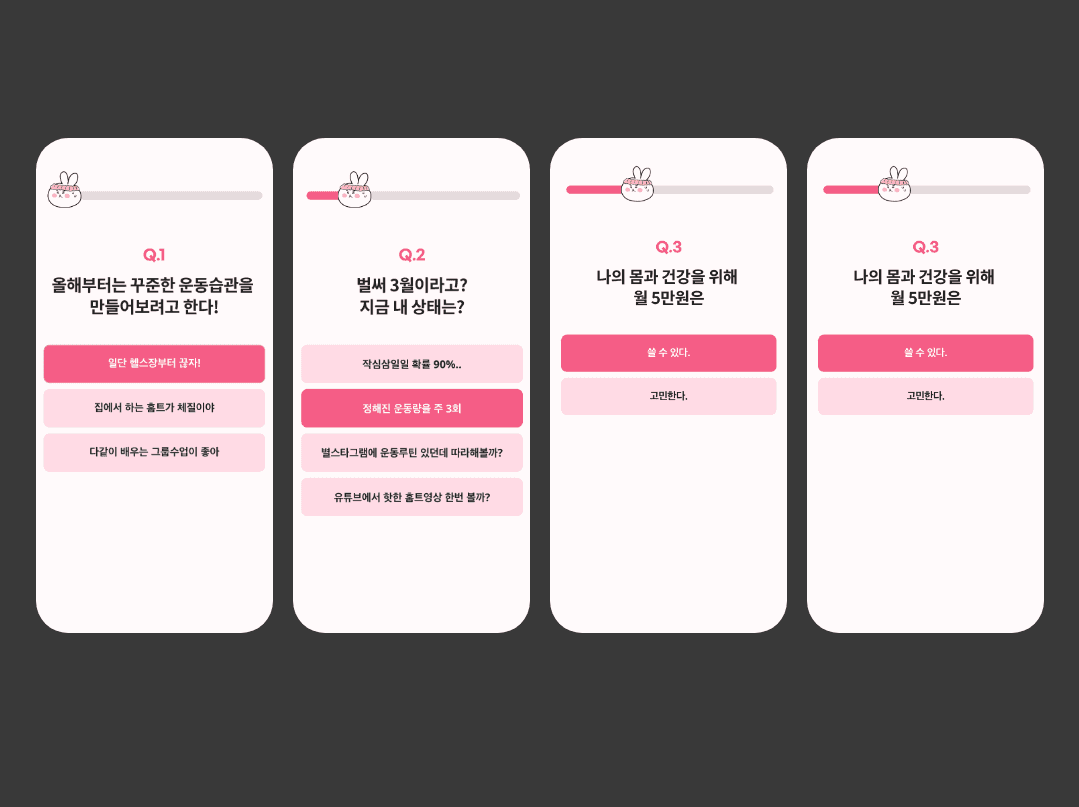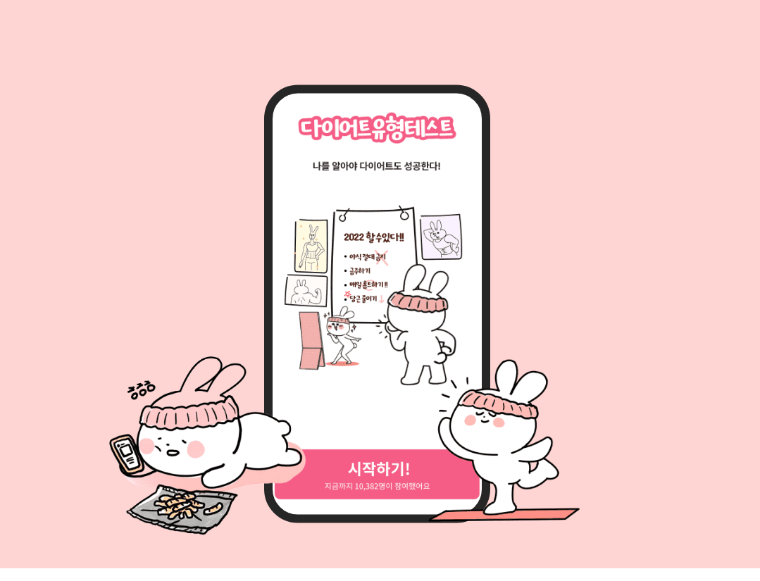 유저의 성향에 맞는 운동 루틴을 캐릭터 기반으로 추천하는 참여형 다이어트 테스트 서비스입니다. 간단한 선택형 문답과 귀여운 캐릭터로, 다이어트의 첫 진입장벽을 낮추고 공감 가는 결과 페이지로 자발적 공유를 유도했습니다.