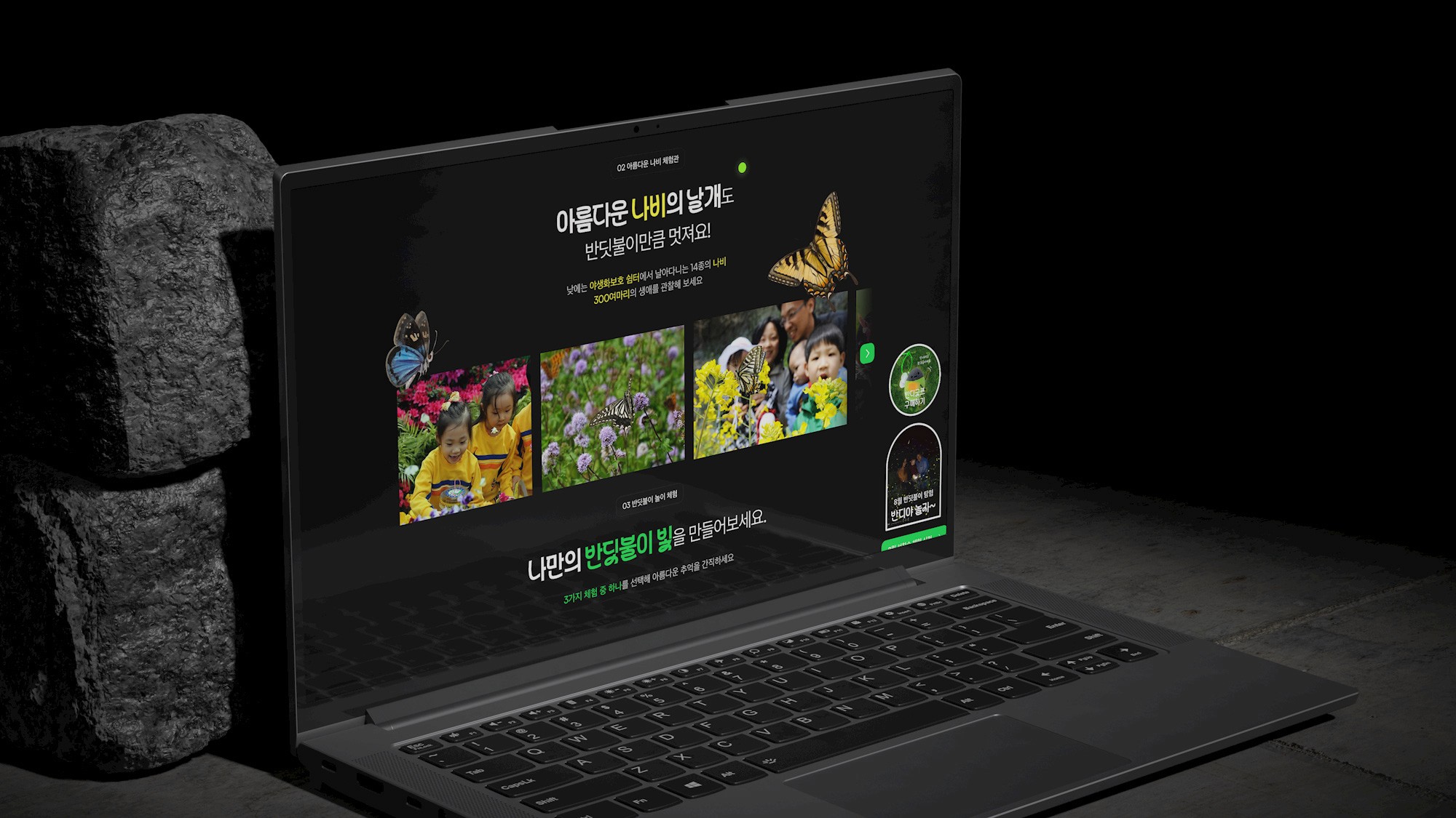 자연 생태 테마에 맞춰 어두운 밤하늘과 반딧불이의 은은한 빛을 시각적으로 구현하여, 방문자에게 몰입감 있는 경험을