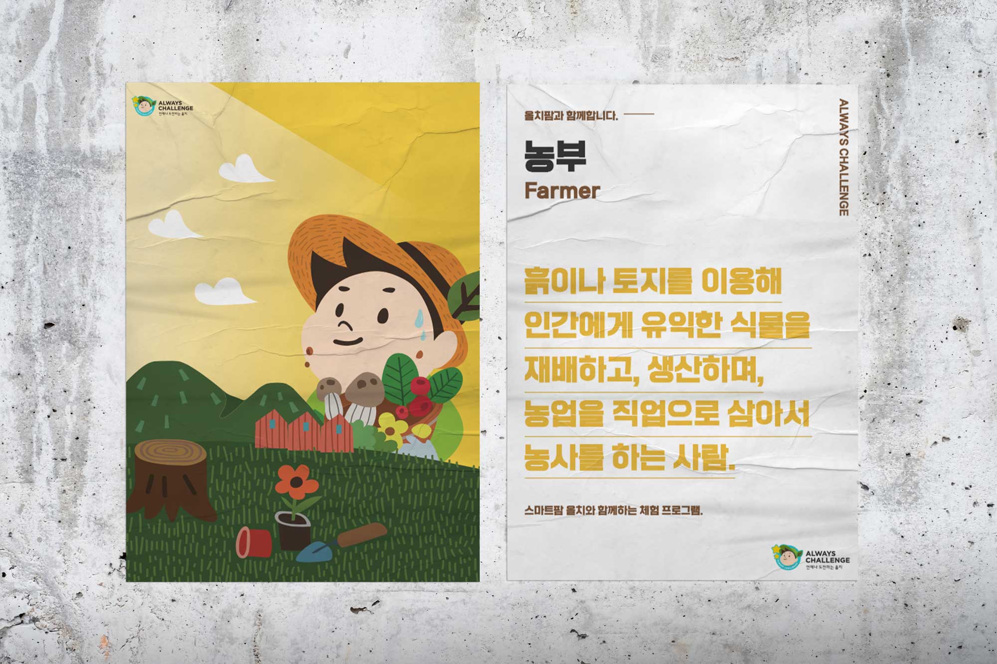 어린이들이 다양한 직업을 쉽고 흥미롭게 이해할 수 있도록 스마트팜 연계 교육 콘텐츠에 맞춘 포스터 시리즈를 디자인했습니다. 각 직업별 특성을 상징적으로 표현하고, 컬러풀하고 친근한 일러스트로 교육적 몰입도를 높였습니다.